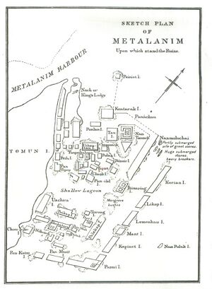 Nan Madol lies on a shallow reef flat adjoining Temwen Island, just off the main island of Pohnpei. The islets extend outward into the lagoon and are surrounded by a network of natural and constructed waterways.